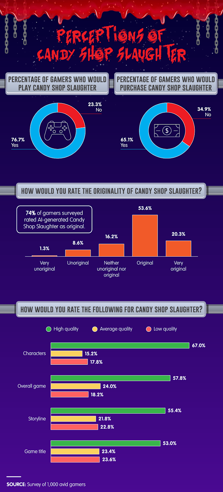 We utilized the artificial intelligence program GTP-3 to create the description for a completely unique video game with story mode, multiplayer capabilities, and 12 different characters. Without any human input on the game, we found a majority of gamers were willing to purchase and play the game themselves. Many gamers also considered the premise of Candy Shop Slaughter unique, but it was the characters that proved most impressive.