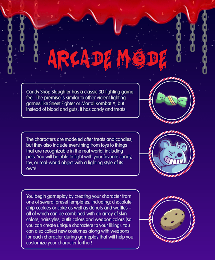 In arcade mode, Candy Shop Slaughter turns into a classic 3D fighting game, where blood and guts are transformed into candy and treats and players can experience plenty of food puns and jokes along the way. Players start by creating characters from a template and have the opportunity to unlock new costumes and weapons as they play.