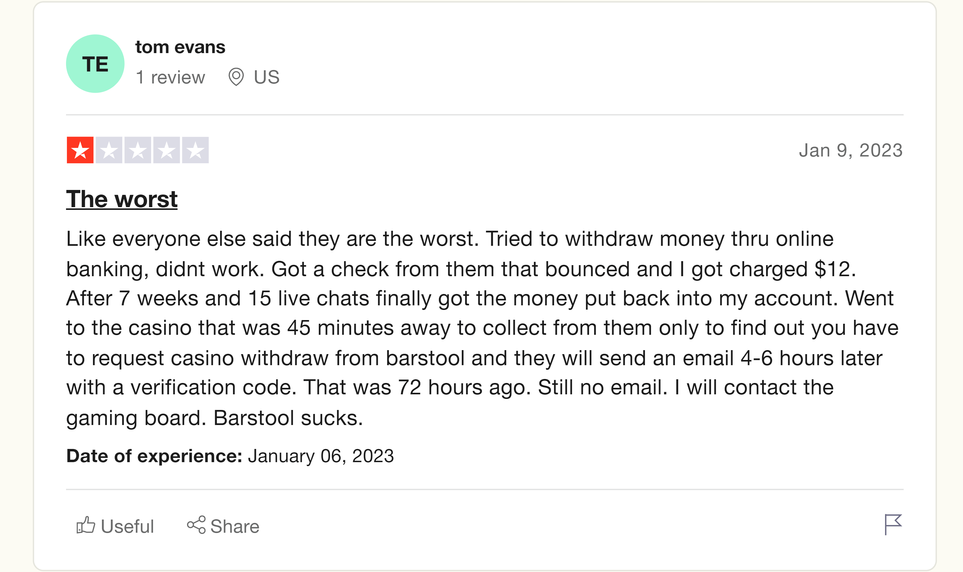 Many users had left negative comments on the site’s sportsbooks, highlighting lengthy verification processes and slow withdrawals. Yet, there were very few for the brand’s online casino. Still, we’d love to see Barstool respond to some of these reviews and attempt to resolve the issues.